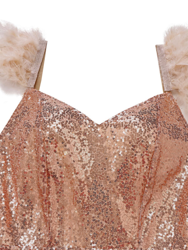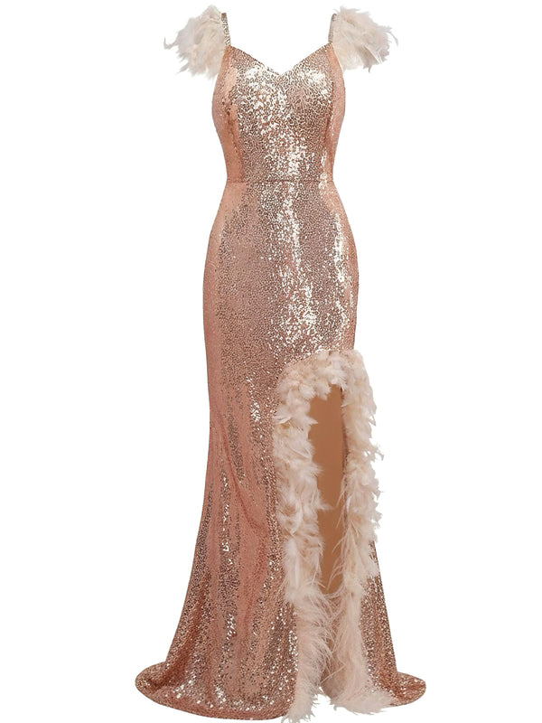 1930s V-Neck Feather Strap High Slit Sequined Dress