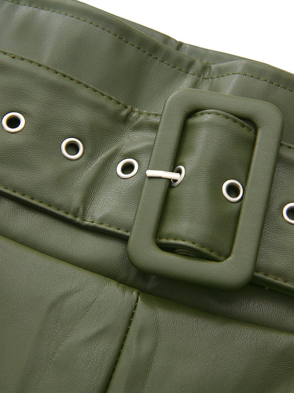 1940s High-Waist Metal Belt PU Leather Wide-Leg Pants