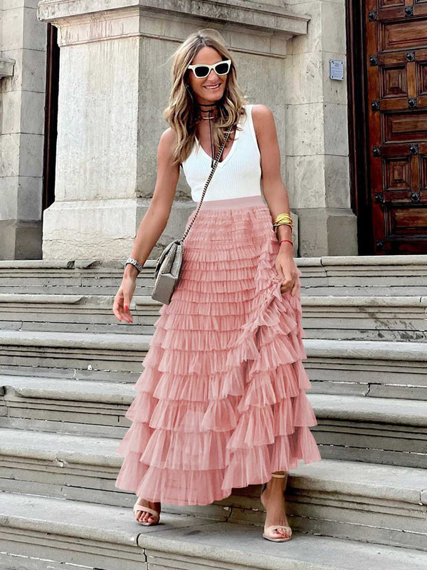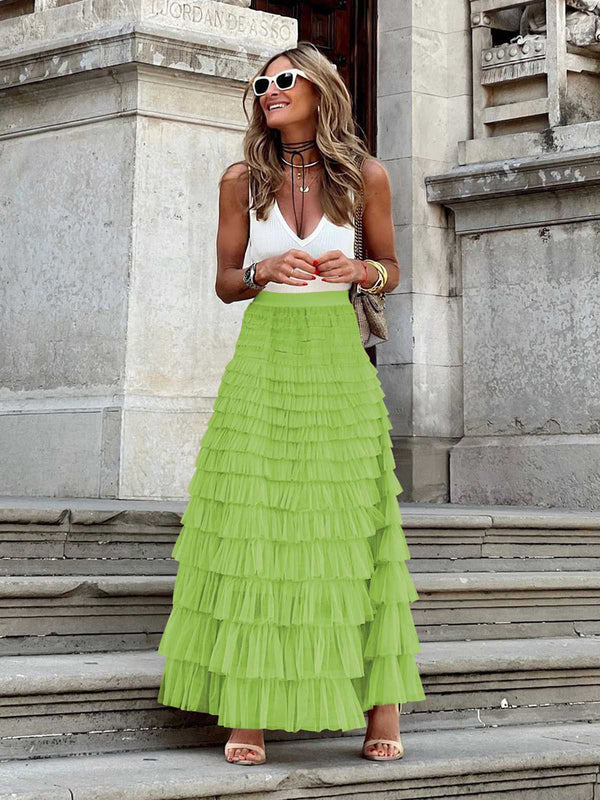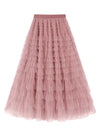 1940s Tiered Mesh Ruffle A-Line Solid Skirt