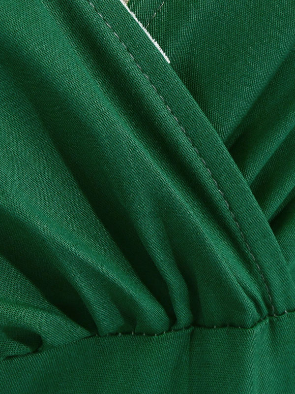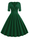 Garden parties feel effortlessly romantic in this Retro Stage 1950s dress, perfect for vintage lovers who adore rich color with a classic, flattering fit. The crossover V-neck bodice and short sleeves shape the waist, blooming into a full swing skirt in deep emerald green that twirls beautifully with every step. Slip into this 1950s swing dress with heels and pearl earrings and you’ll look polished, confident, and timelessly vintage all day.