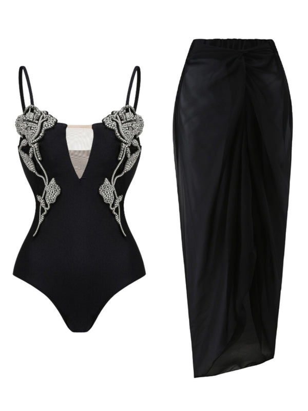 2PCS Black 1980s Rhinestone Rose Swimsuit & Cover-Up