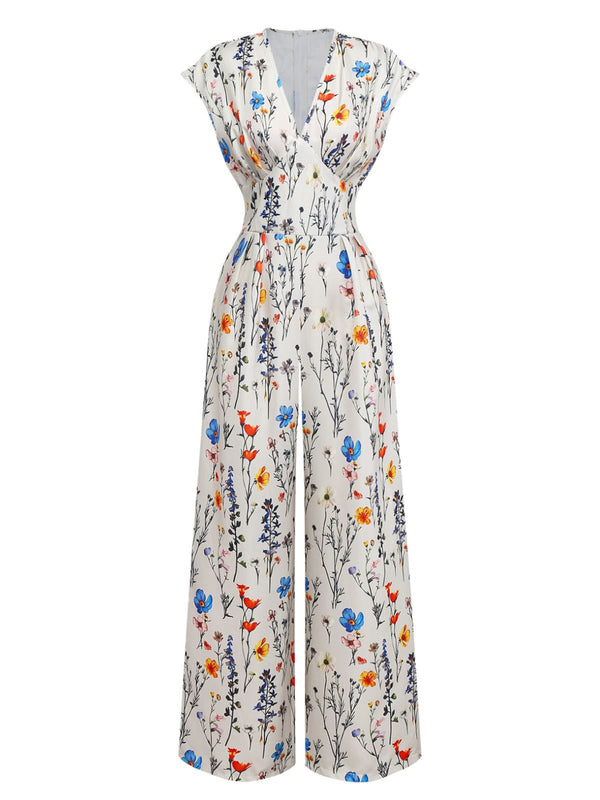 Beige 1950s Floral V-Neck Cap Sleeve Jumpsuit
