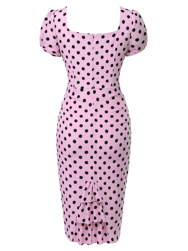 Office cocktails feel delightfully retro in this Retro Stage pin up dress, perfect for vintage lovers who like their look sleek and curve-hugging. Soft ivory fabric scattered with inky polka dots shapes a sweetheart neckline and gently puffed sleeves above a fitted pencil silhouette that traces every curve to the knee. Slip into this women’s 1960s polka dot wiggle dress with heels and red lipstick, and you’ll look like the most polished pin-up at any dinner, date or party.