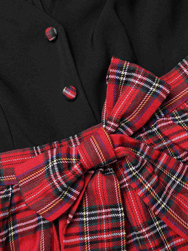 [Pre-Sale] Black 1940s Bowknot Plaid Patchwork Lapel Dress