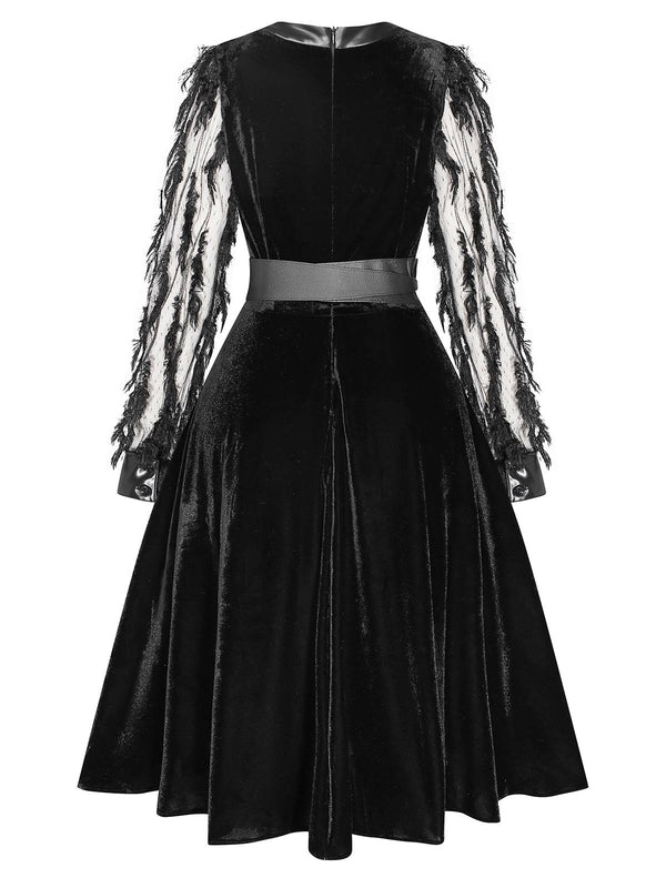 [Pre-Sale] Black 1950s Feather Sheer Sleeve V-Neck Leather Dress
