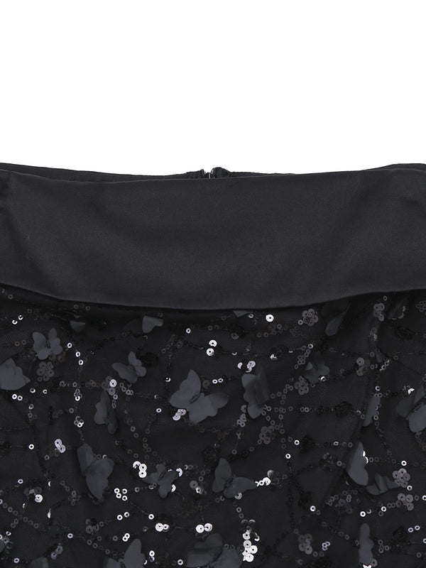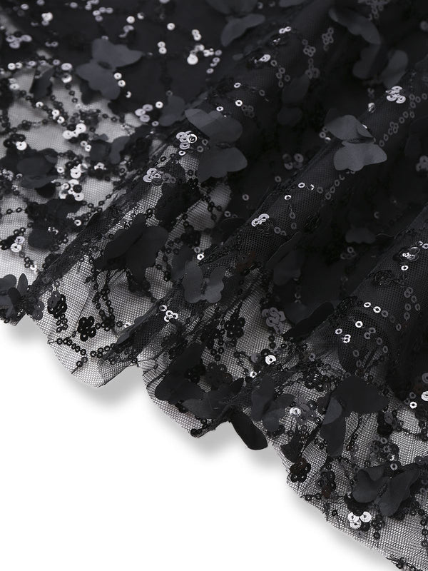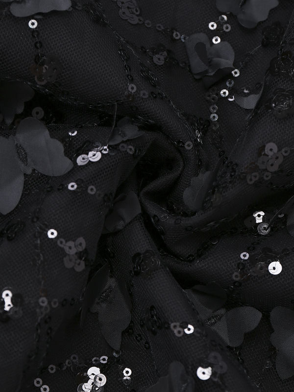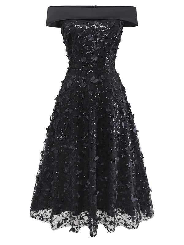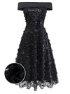 [Pre-Sale] Black 1970s Lace Rose Sequin Off Shoulder Midi Dress | Retro Stage