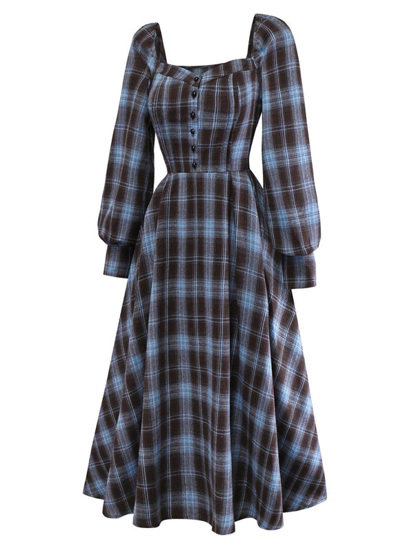 [Pre-Sale] Blue Grey 1940s Plaid Sweetheart Neck Brushed Dress