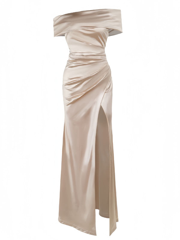 Champagne 1930s Off Shoulder Slit Satin Dress