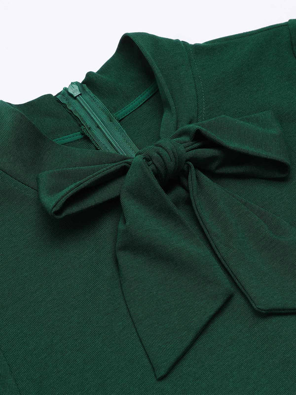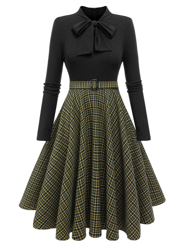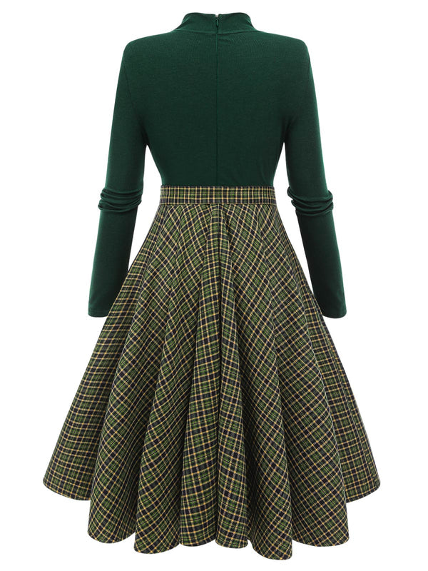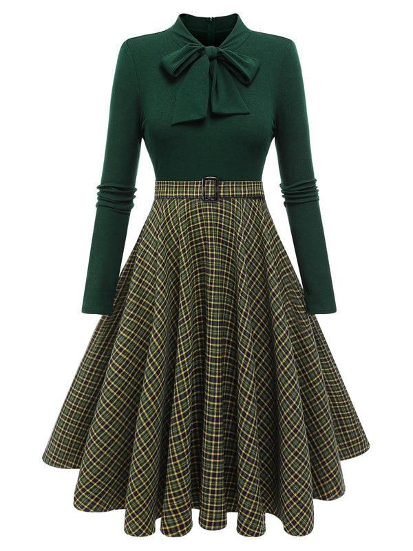 Autumn days feel charmingly old-school in this Retro Stage 1950s dress, made for vintage lovers who adore cosy campus-girl style. Deep forest-green knit smooths over the bodice with a flattering, fitted shape, cinching neatly at the waist before swishing out into a full, checked swing skirt that twirls with every step. At the neckline, a sweet bow tie nods to 1950s secretary chic, while the classic green-and-mustard plaid adds just the right touch of preppy nostalgia. Slip into this 1950s dress with Mary Janes, soft curls and a beret for coffee dates, bookshop browsing or festive office days, and you’ll look like the smartest retro sweetheart in the room.