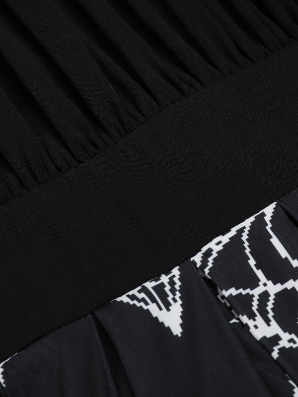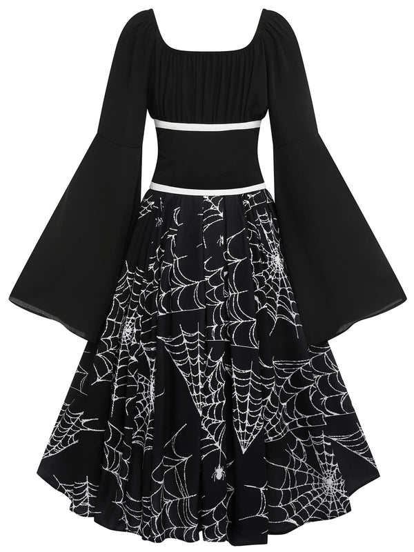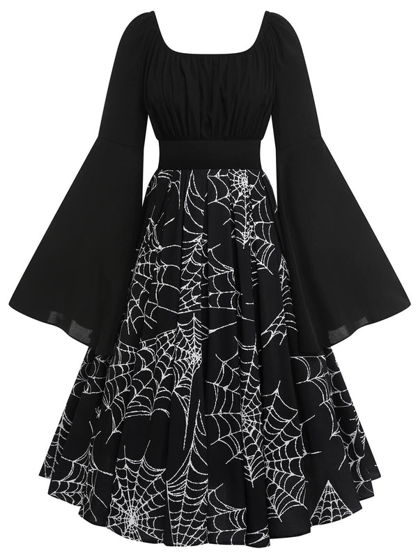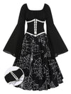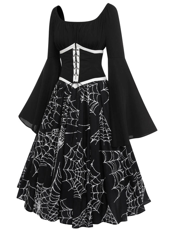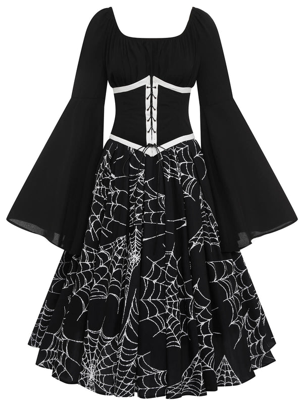 Features: Lace-Up Patchwork Girdle; U-Neck Pullover; Bell Sleeves