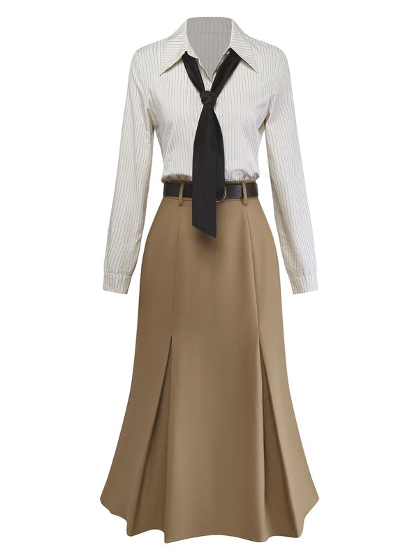 [Pre-Sale] Khaki 1930s Striped Lapel Blouse Detachable Tie Dress | Retro Stage