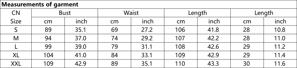 Note: The Measurements of the garment charts may vary due to different products or suppliers.