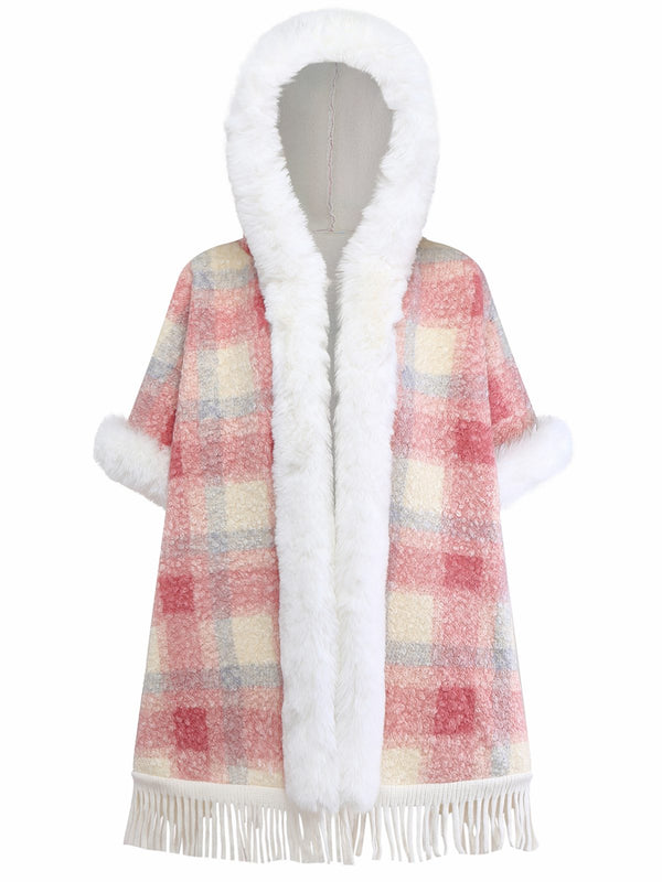 Pink 1930s Plaid Flannelette Fringed Hem Hooded Coat