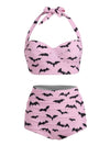 Make a spooky splash this summer with our Halloween-themed two-piece swimsuit. This retro bikini features a unique and vibrant print of skulls, sunflowers, and spider webs set against a classic black background. With a supportive halter neck top and a flattering high-waisted bottom, this set offers the perfect blend of vintage style and macabre charm for your next pool party or beach day.Composition: 82% Polyester, 18% Elastane