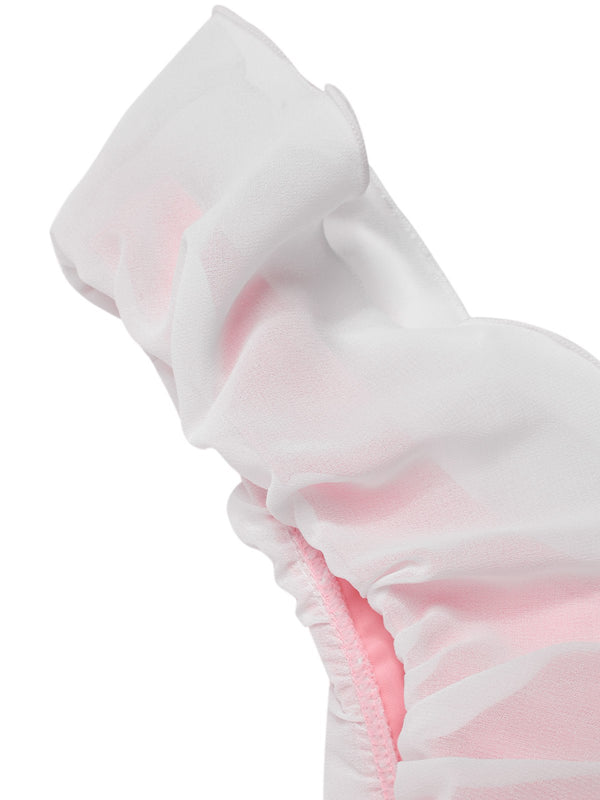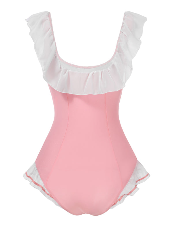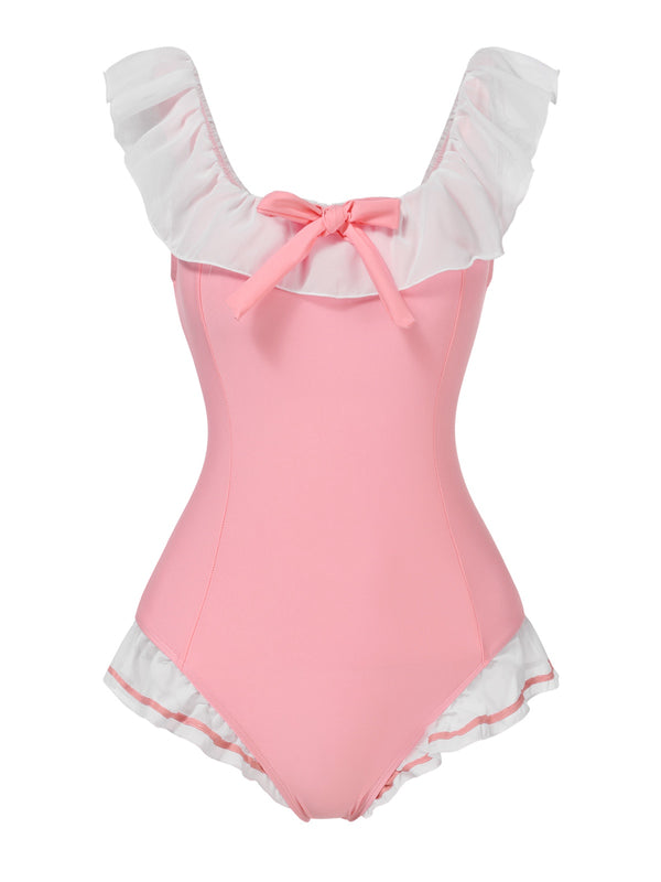Pink 1950s Bowknot Lapel One-Piece Swimsuit