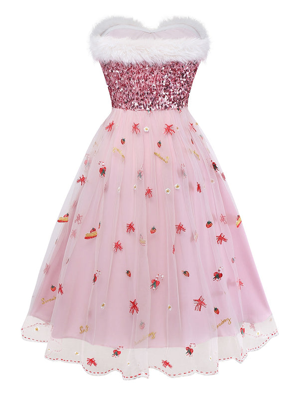Holiday parties feel like a sugar-plum fairytale in this Retro Stage 1950s Christmas dress, perfect for vintage lovers who adore sweet sparkle. The strapless bodice is covered in rosy sequins with a soft white trim, while the pink tulle swing skirt is scattered with tiny festive motifs. Slip into this 1950s Christmas party dress and you’ll look like the prettiest holiday confection in the room.