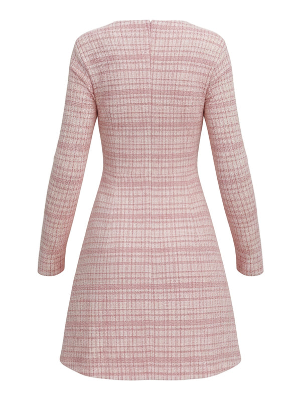 Pink 1960s Plaid Tweed Buttoned Square Neck Dress