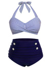 [Plus Size] Blue 1940s Striped Halter Bowknot Bikini Set