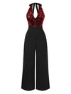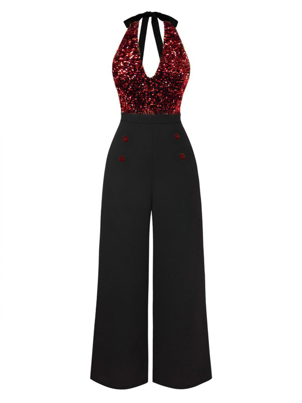 Dramatic contrast defines this Retro Stage 1930s jumpsuit, where old-Hollywood glamour meets confident tailoring. The halter neckline is drenched in shimmering gold sequins that catch the light beautifully, balanced by sleek black wide-leg trousers that fall long and fluid from a cinched waist. Striking yet refined, this piece creates an elongated silhouette with undeniable presence—perfect for evenings that call for elegance, attitude, and a touch of vintage drama.