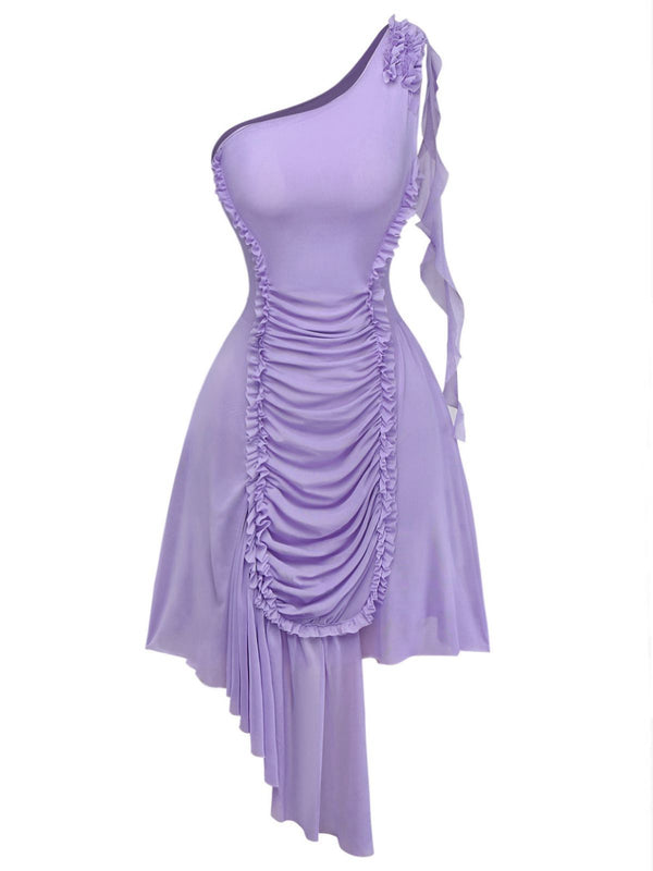 Purple 1970s Mesh One-Shoulder Ruffled Asymmetrical Dress | Retro Stage