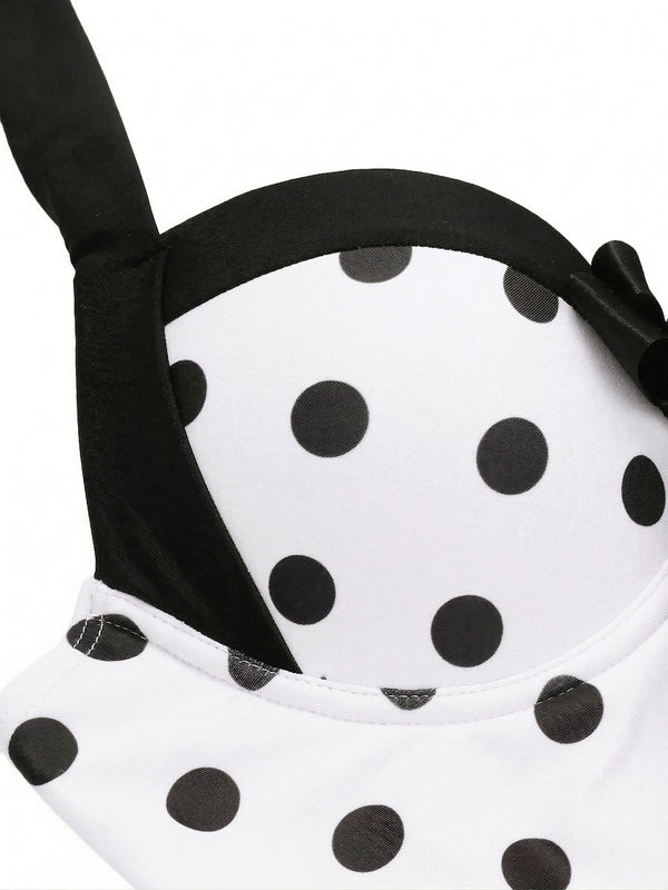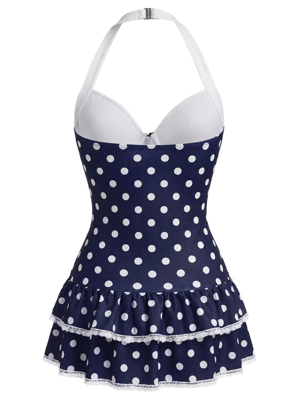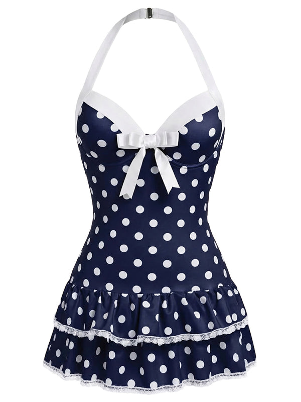 Pool days feel like a pin-up postcard in this Retro Stage 1940s swim dress, perfect for vintage lovers who adore polka dots. The pink halter top with black spots, sweetheart neckline and bow detail skims into a flouncy double-ruffle skirt, making this 1940s pink polka dot swimsuit as cute as it is confidence-boosting.