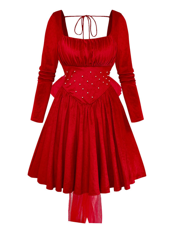 Red 1950s Velvet Pearl Ruched Tulle Bow Dress