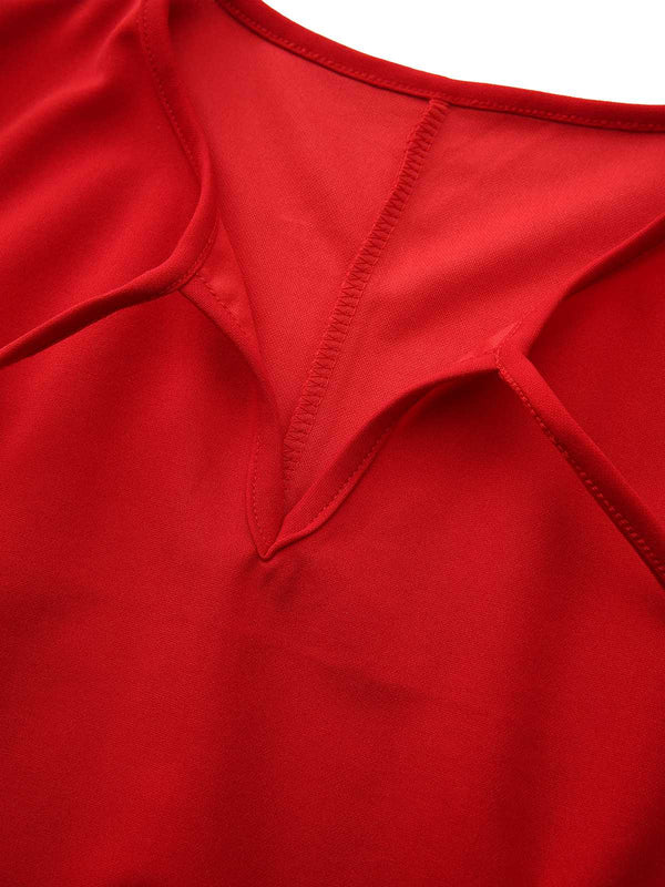 Red 1960s Bow Neck Ruffle Hem Sleeveless Dress