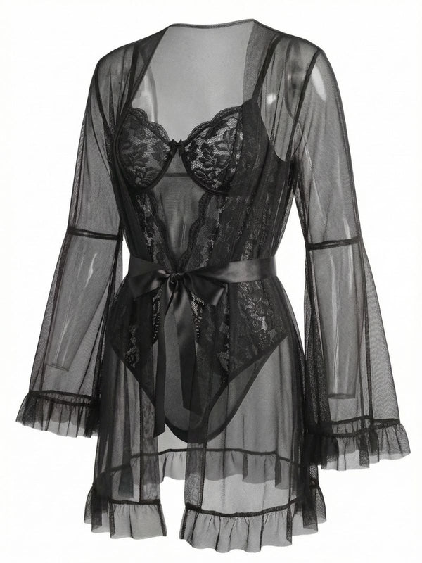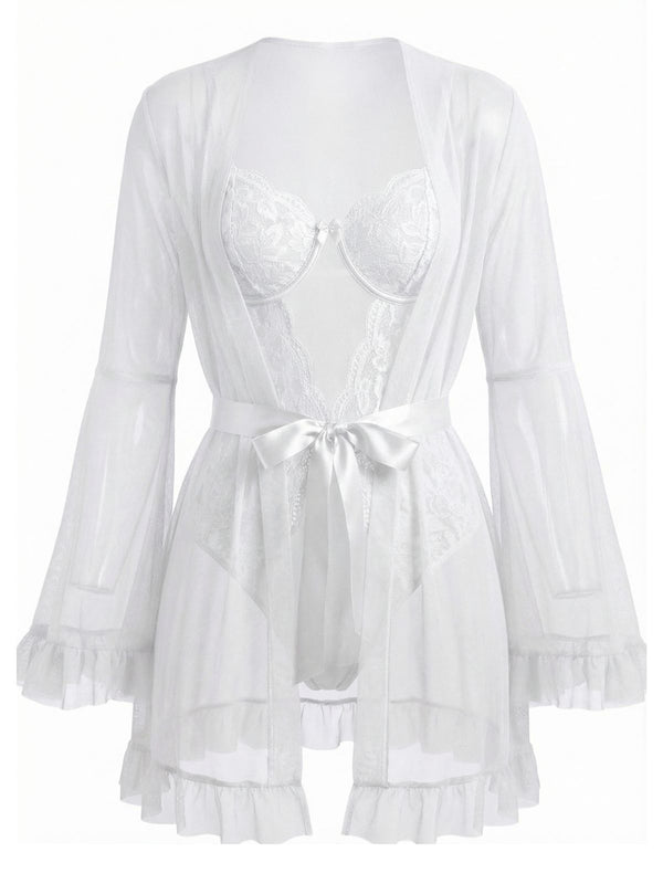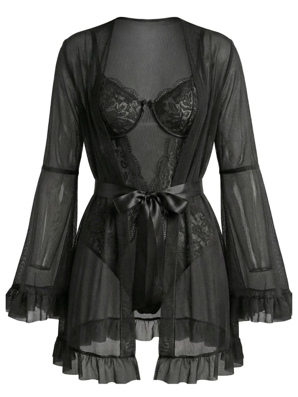 Red 1960s Solid Sheer Lace Patchwork Sleepwear Set