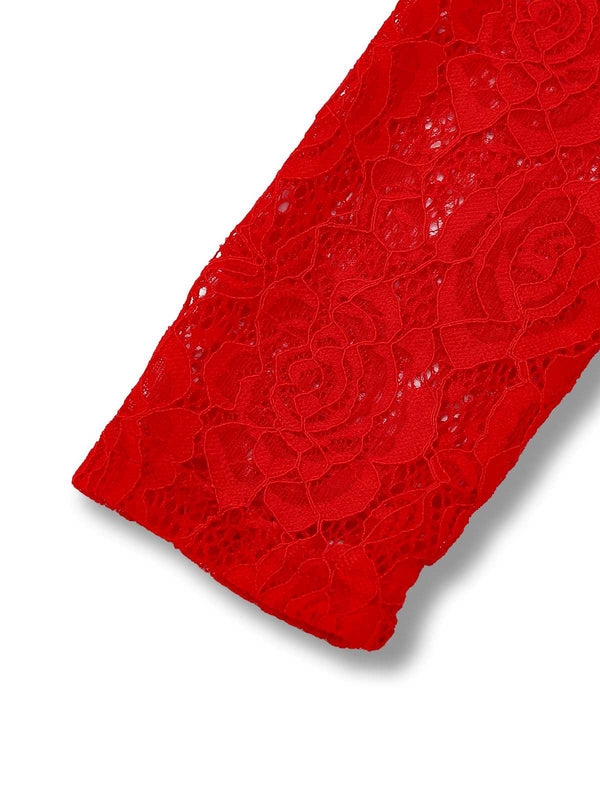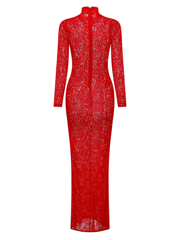 Red 1980s High Neck Sheer Lace Bodycon Maxi Dress | Retro Stage