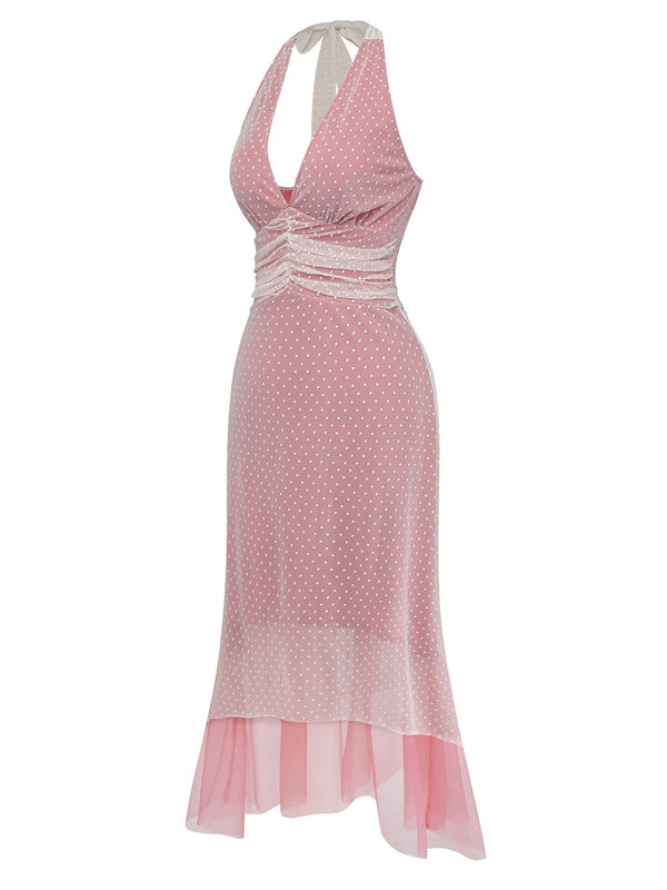[Pre-Sale] Rose Pink 1930s Polka Dot Mesh V-Neck Dress | Retro Stage