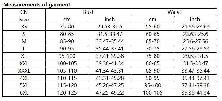 There are 10 sizes (XS/S/M/L/XL/XXL/XXXL/4XL/5XL/6XL) available. Please allow 1-2cm differences due to manual measurement. Thanks for understanding! (All measurements in cm and please note 1cm=0.39inch)