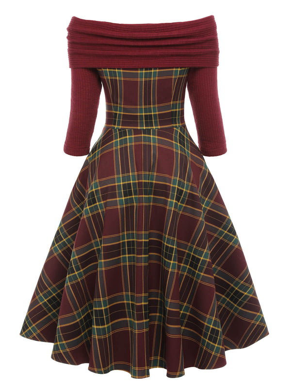 Holiday nights feel beautifully classic in this Retro Stage 1950s dress, perfect for vintage lovers who adore cozy glamour with a tartan twist. The off-shoulder burgundy neckline is finished with chic button accents, framing a fitted waist before the rich plaid skirt flares into a full swing silhouette made for twirling. Slip into this 1950s tartan swing dress with heels and a red lip and you’ll look polished, festive, and photo-ready from first toast to last dance.