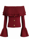 Wine Red 1960s Off-Shoulder Flare-Sleeve Knitted Top